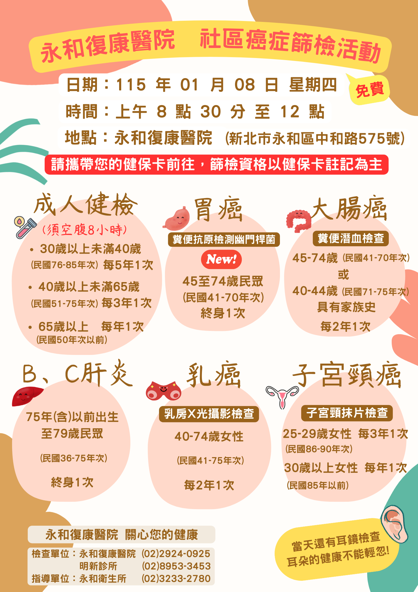 內容有成人健檢,胃癌,大腸癌,B、C肝炎,乳癌、子宮頸癌