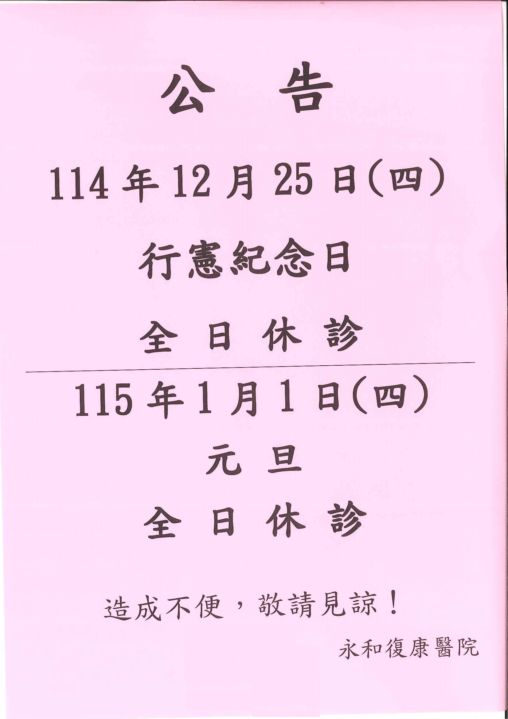 114年行憲紀念日(12/25)、115年元旦(1/1) 休診公告