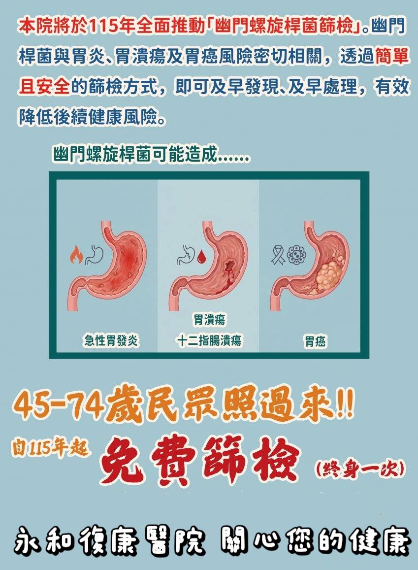 115年起本院提供免費胃癌篩檢服務,歡迎有需要民眾多加利用