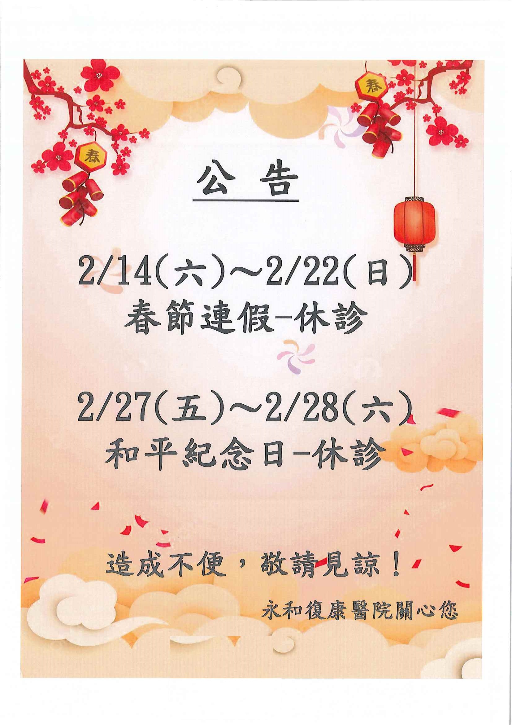 115年春節假期、和平紀念日 停診公告