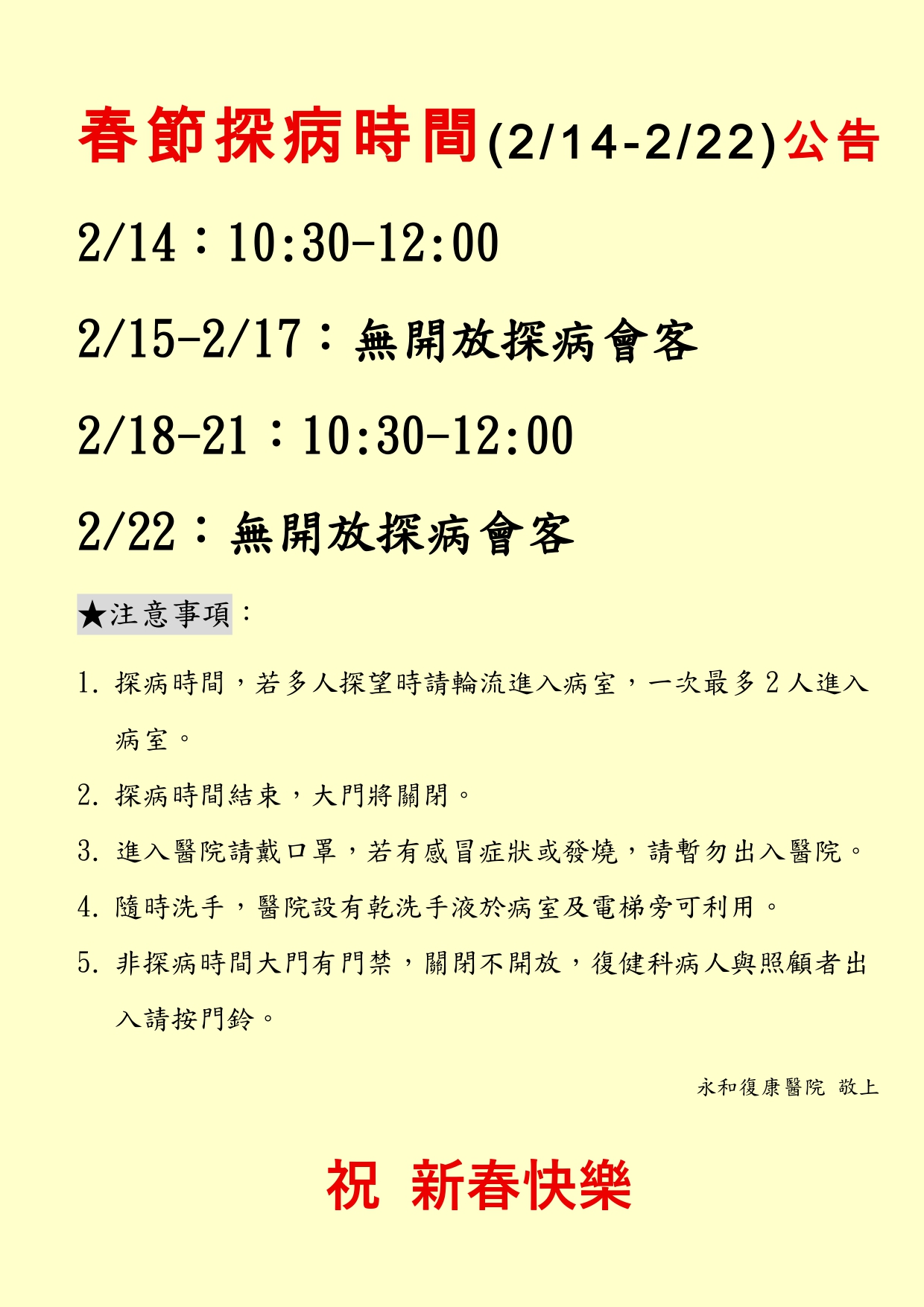 春節探病時間(2/14-2/22)公告