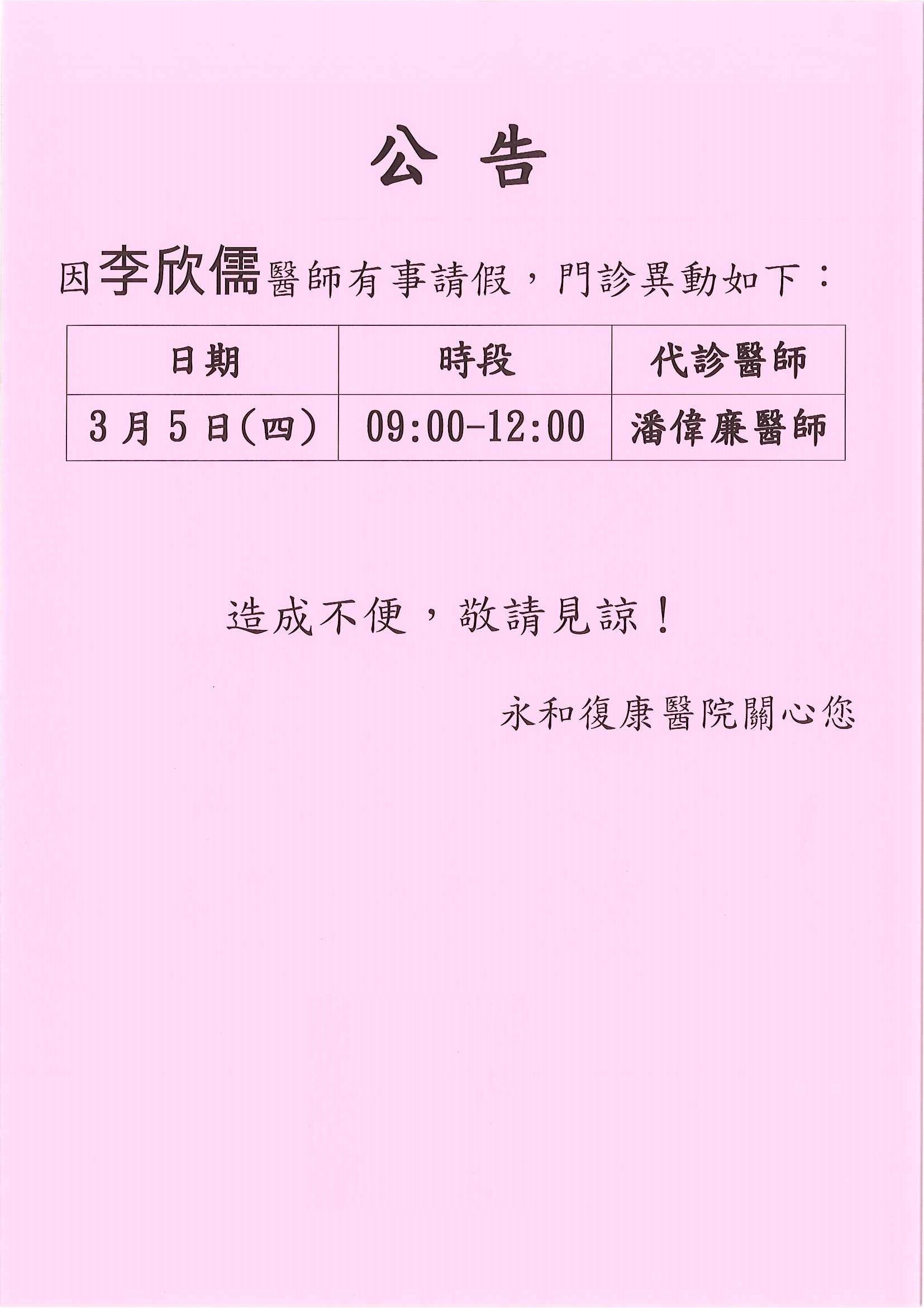 115年3月心臟內科李欣儒醫師請假公告(3/5)